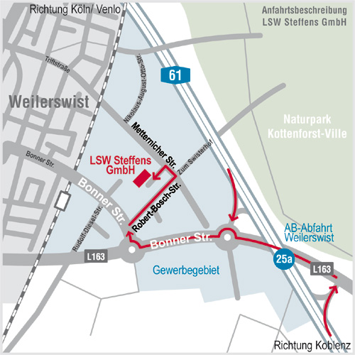 Sie erreichen uns am einfachsten über die A61. Verlassen Sie die Autobahn an der Ausfahrt Weilerswist. Von Süden aus Richtung Koblenz kommend biegen Sie nach links ab, von Norden aus Richtung Köln/Venlo kommend nach rechts und fahren Sie in das Gewerbegebiet. Nach ca. 500 Meter kommen Sie in einen Kreisverkehr. Verlassen Sie den Kreisverkehr an den ersten Ausfahrt (3 Uhr) und folgen Sie der Bonner Strasse.